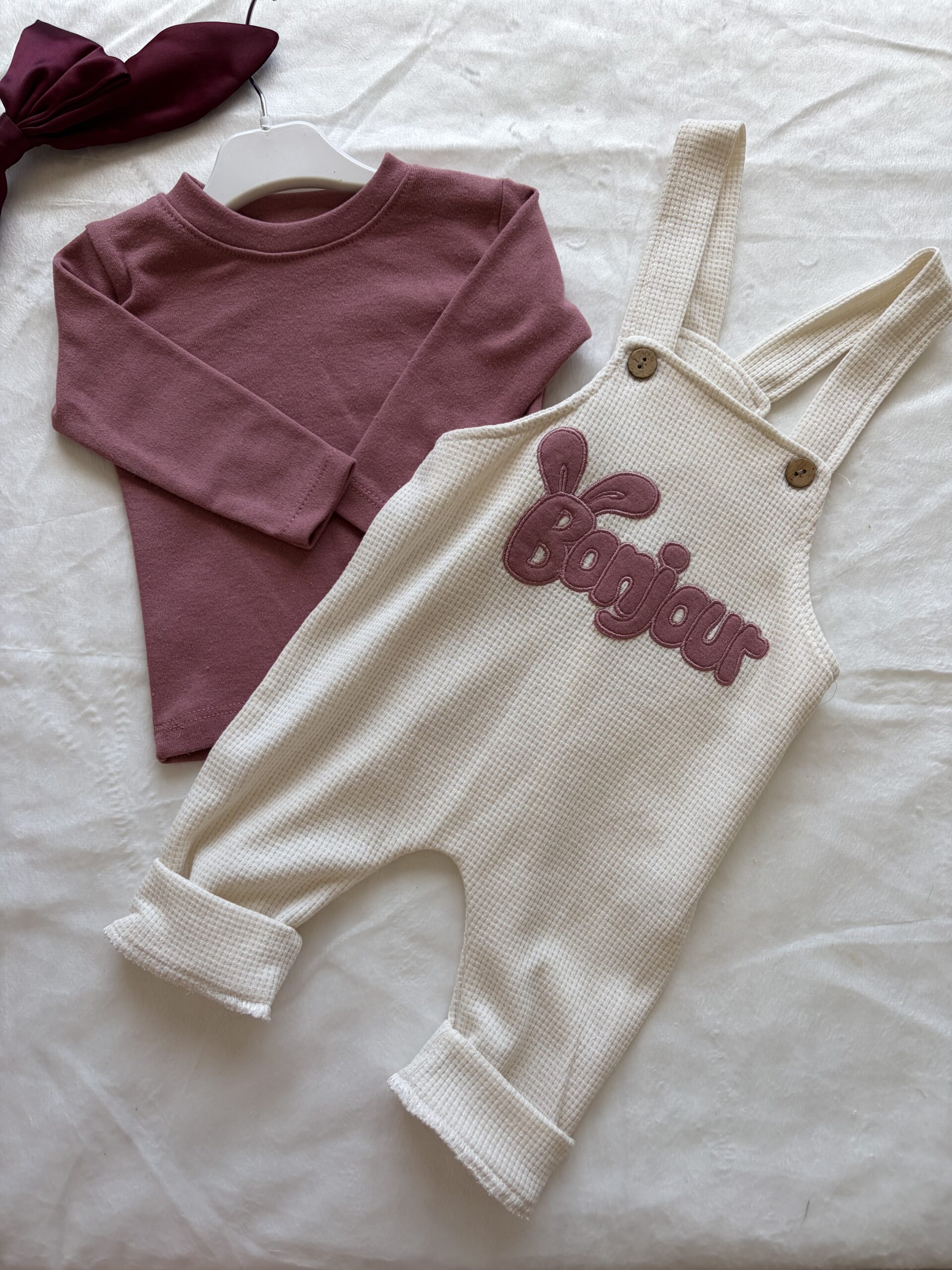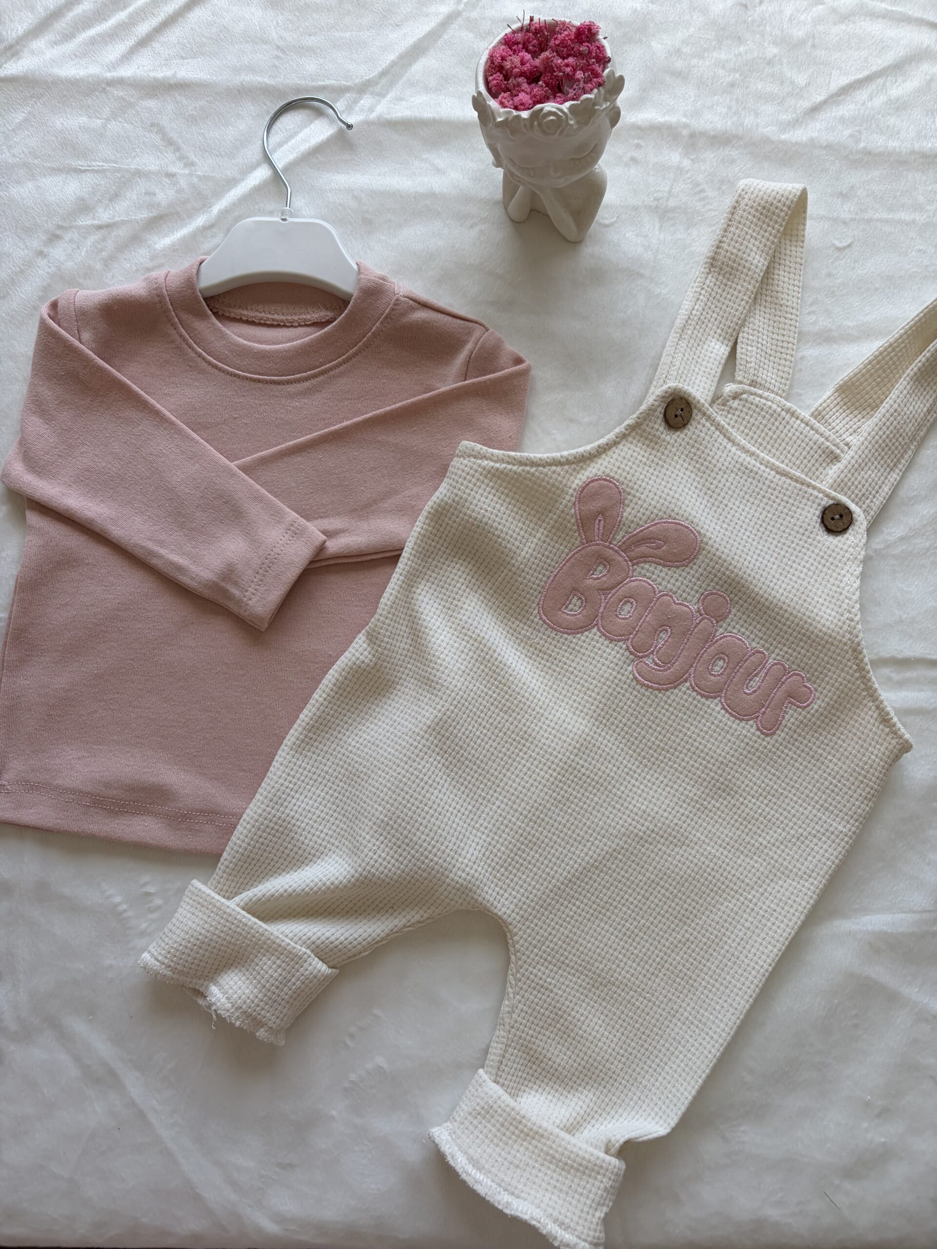 Ensemble confortable composé d’une salopette douce avec broderie “Bonjour” et d’un haut manches longues.